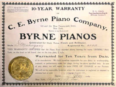 Piano merk eigendom van Byrne Piano Co., gebouwd in eigen fabriek.